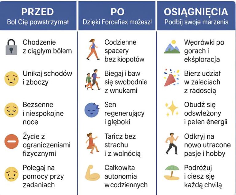 👉 Zamiast rezygnować z ulubionych aktywności, sprawdź jak regularne stosowanie Forceflex może wspierać Twoją codzienną mobilność.